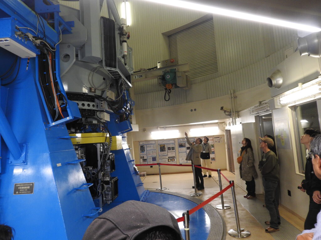 あいにく、60cm望遠鏡(高橋製)及びCaK&Hαフィルターによる太陽の昼間観測は曇り&雨の天候のため、施設見学のみに終わり、2mなゆた望遠鏡(三菱電機)による夜間観測も見学のみとなり、代わりに国立天文台のMitaka&偏光フィルタ・メガネによる立体視投影を通じて、太陽系、恒星・惑星・小惑星・彗星、銀河・星雲の説明や、主鏡清掃(フランスでの再メッキ)等、生の話も聞け、研究現場の実際に触れる貴重な経験になりました。